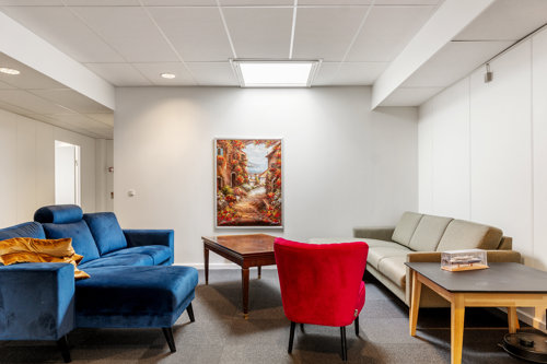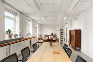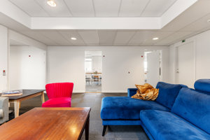 Selve lejemålet på 5. sal fremstår præsentabelt med hvide vægge og mørkegrå tæpper. Her er loungeområde, to køkkener samt to mødelokaler, hvoraf det ene er velegnet til større præsentationer. Derudover er der balkon/terrasser tilknyttet lejemålet, hvor der kan nydes en kop kaffe i pauserne.